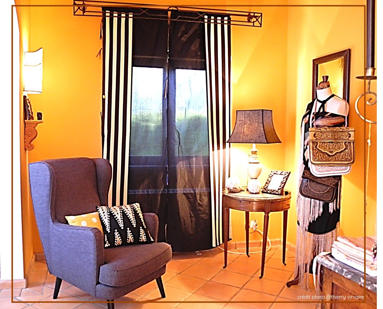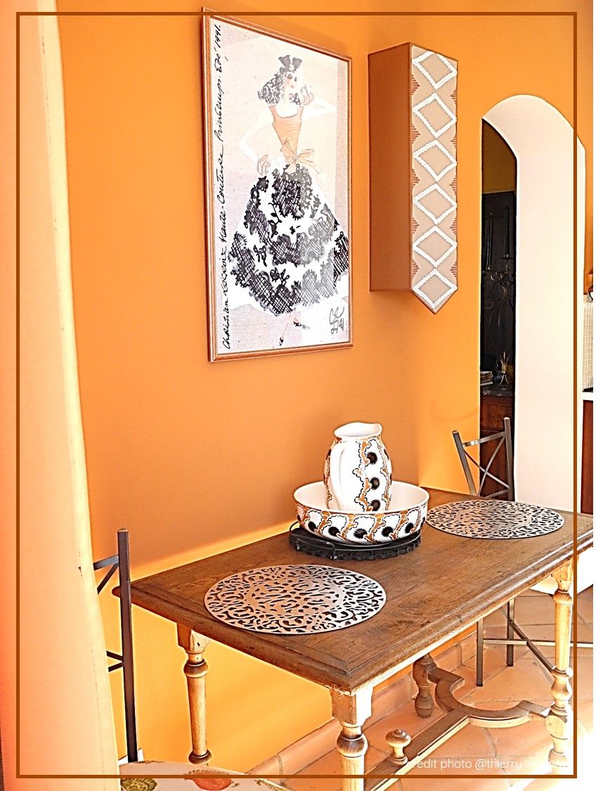 Cette suite est dédiée à ma grand-mère paternelle Isabelle Virvaire, née Bouteau, le 4 décembre 1886 .Elle s’est mariée avec mon grand père, Albert Virvaire le 10 octobre 1910: son portrait en mariée est sur une des petites consoles. Elle fut artiste peintre. Vous verrez ses tableaux dans les salles de bains de la Casa. Ce portait aux pastels a été fait par son amie, la mère d’Antoine de Saint Exupéry dans les années 20. Ne plaisant pas à ma grand-mère, elle l’a retouché elle-même et en a effacé la signature d’origine. Elle porte un grand châle de soie brodée que vous pouvez voir sur la silhouette qui est derrière vous. Les motifs et grandes franges sont caractéristiques de cette époque: bientôt 100 ans! Sur ce mannequin Couture Stockman qui fut mon mannequin d’études lors de ma formation de styliste modéliste à l’Ecole de la Chambre Syndicale de la Couture Parisienne en 86, il y a 3 sacs brodés de marakchis, marchands de la ville de Marrakech.