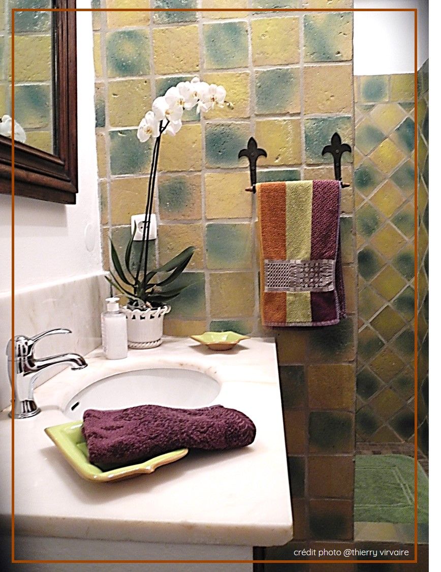 Un cabinet de douche plan vasque marbre et rangement, très grand miroir, douche italienne, toujours en matériaux artisanaux. WC. un mur de carreaux de verre donne de la clarté.